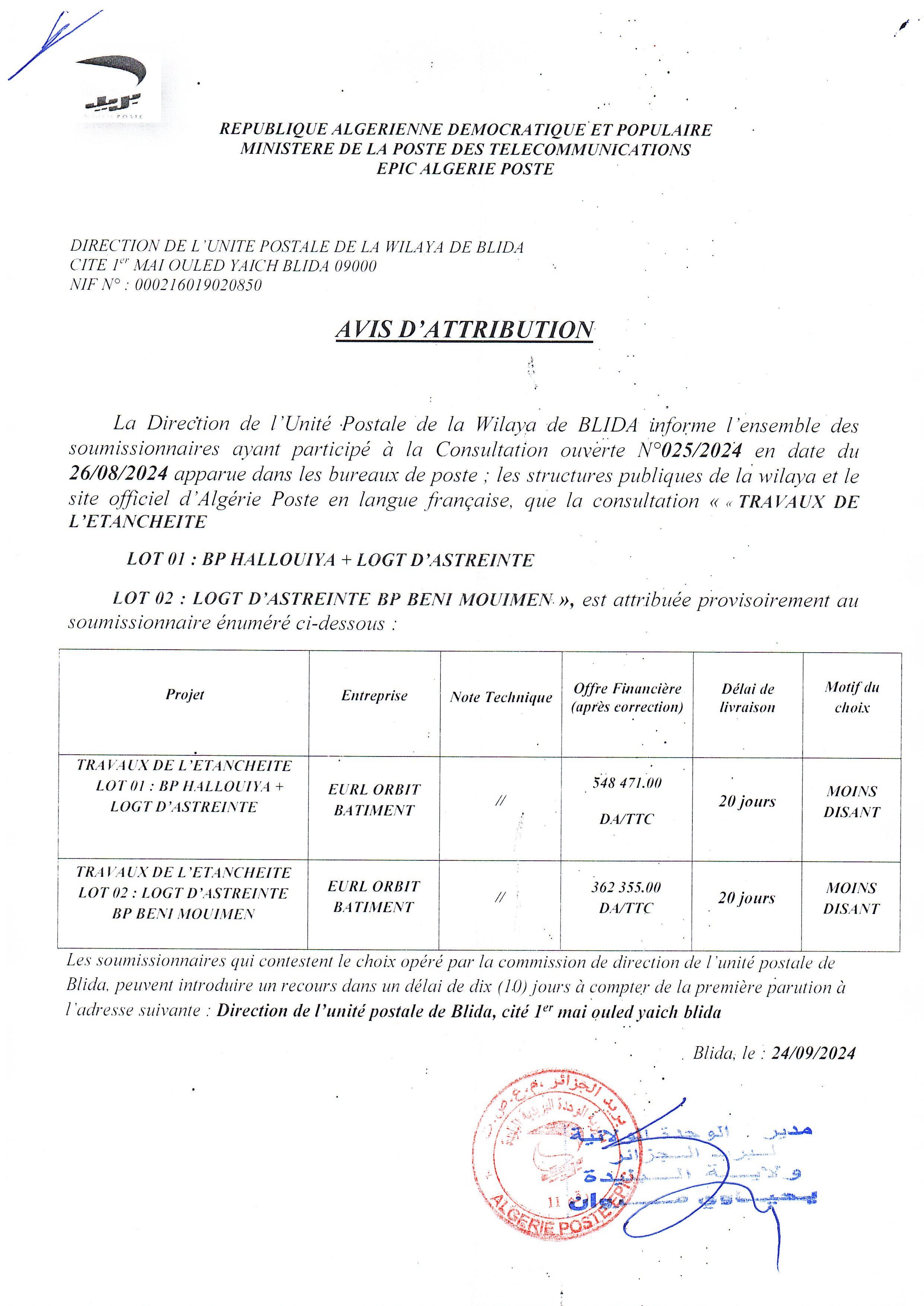 Objet : Travaux d'étanchéité de deux bp en 2 lots bp HALLOUIYA + logt d'astreinte , logt d'astreinte BENI MOUIMEN BLIDA