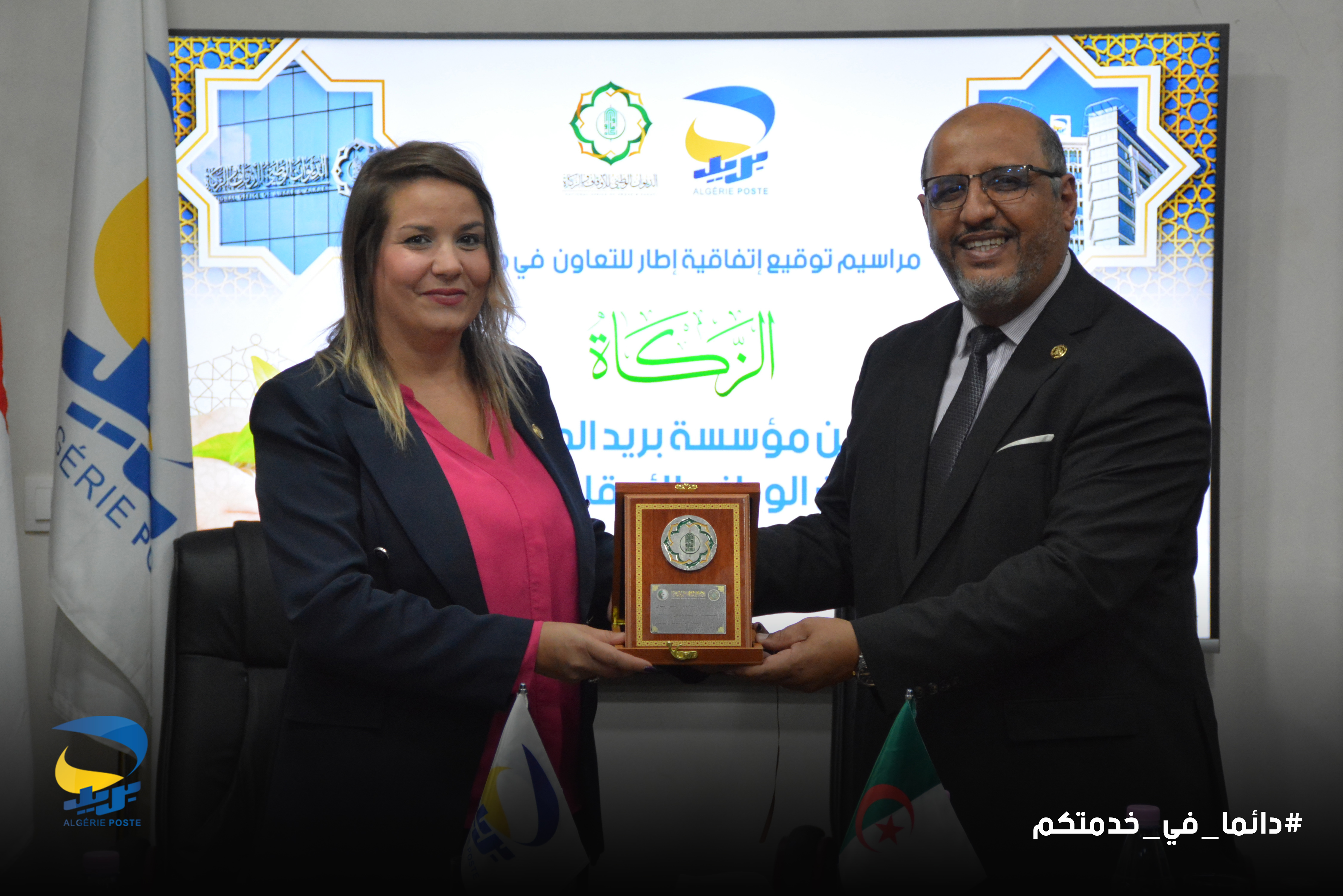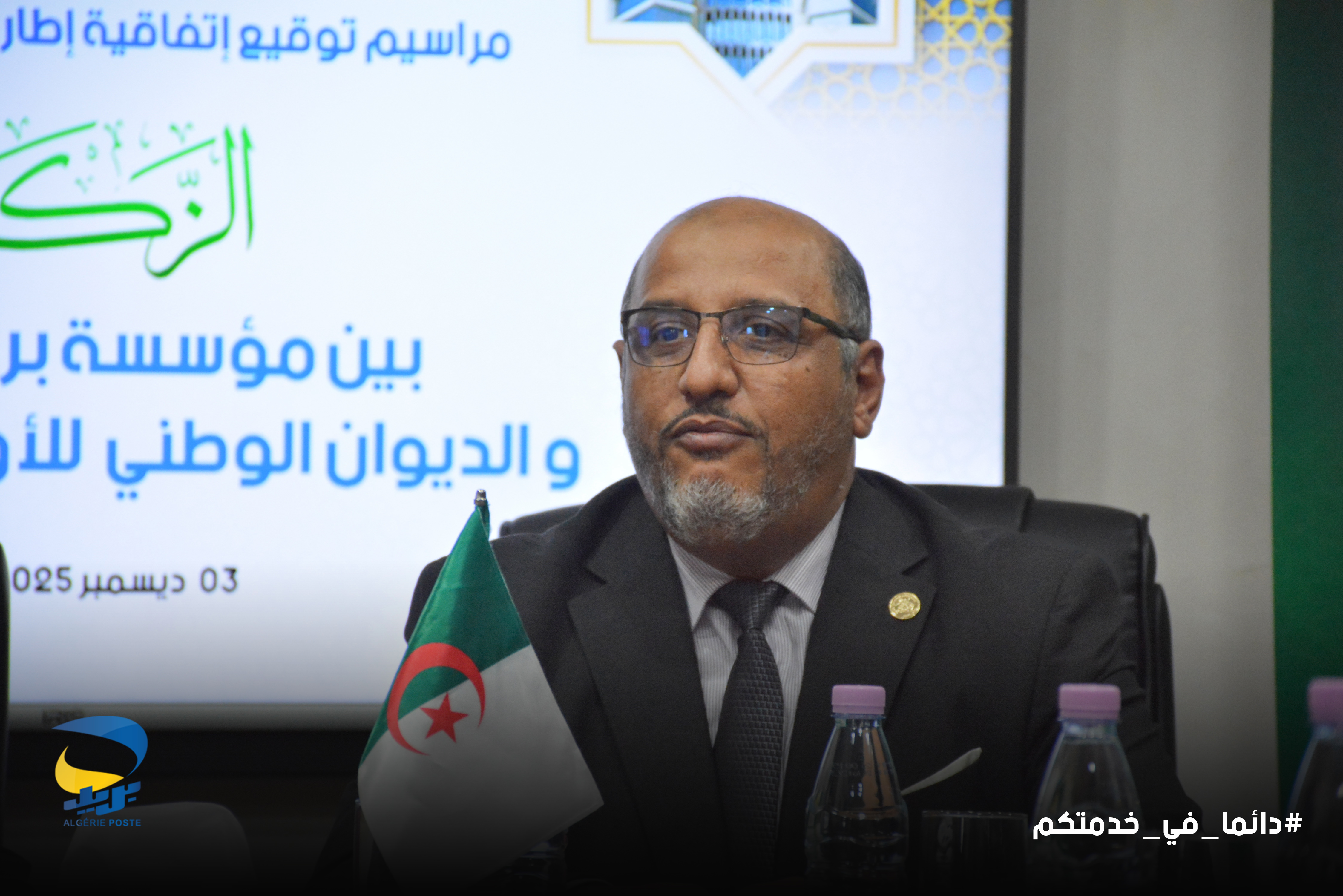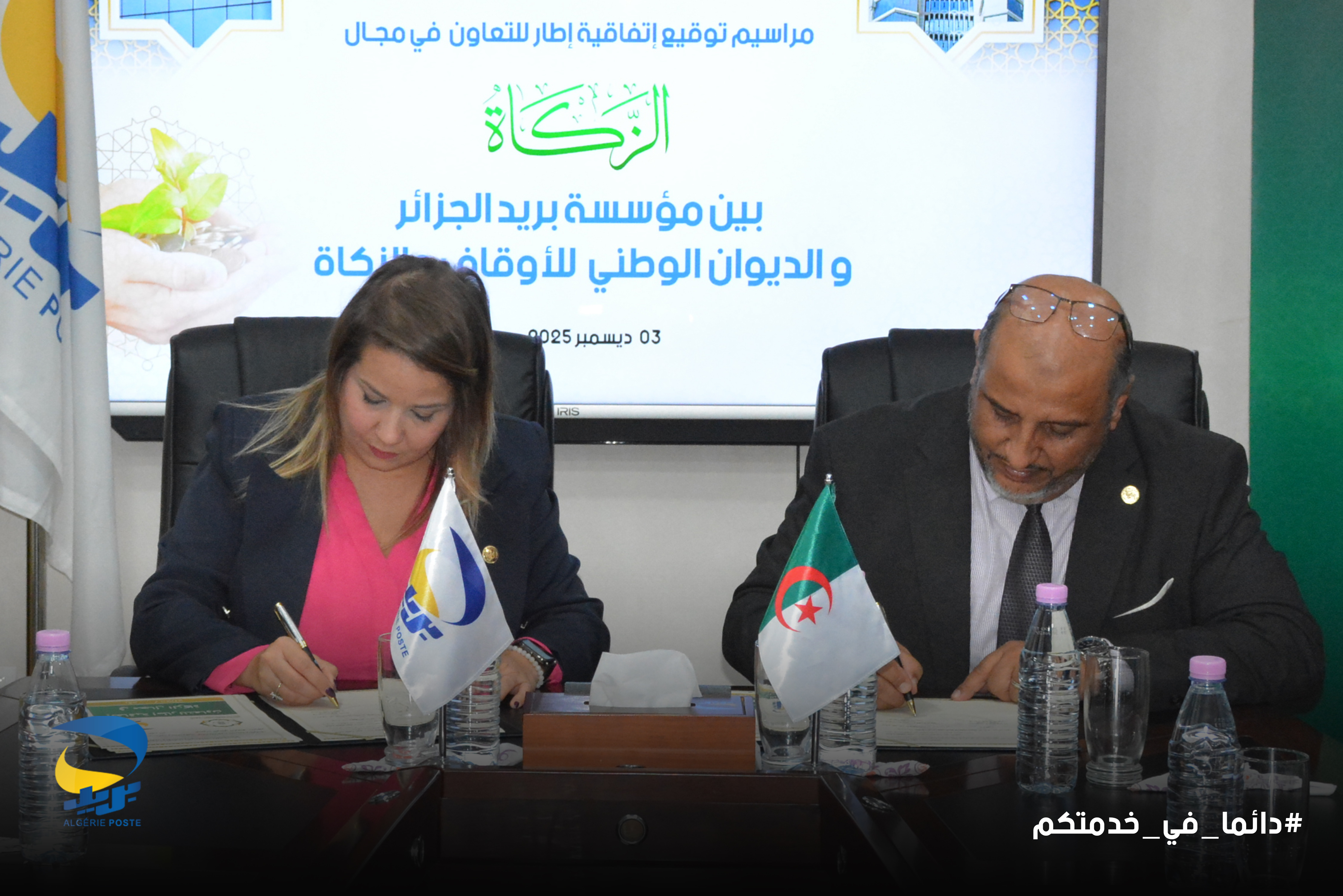 Dans le cadre du renforcement de la coordination entre les organismes publics et du développement de mécanismes de travail conjoints, une convention-cadre de coopération a été signée ce mercredi 3 décembre 2025, au siège de la Direction générale d’Algérie Poste.Cette convention a été signée par Mme Bechiri, Directrice générale d’Algérie Poste, et M. Amhamed Bouziane, Directeur général de l’Office National des Dotations et de la Zakat, relevant du ministère des Affaires religieuses et des Wakfs.