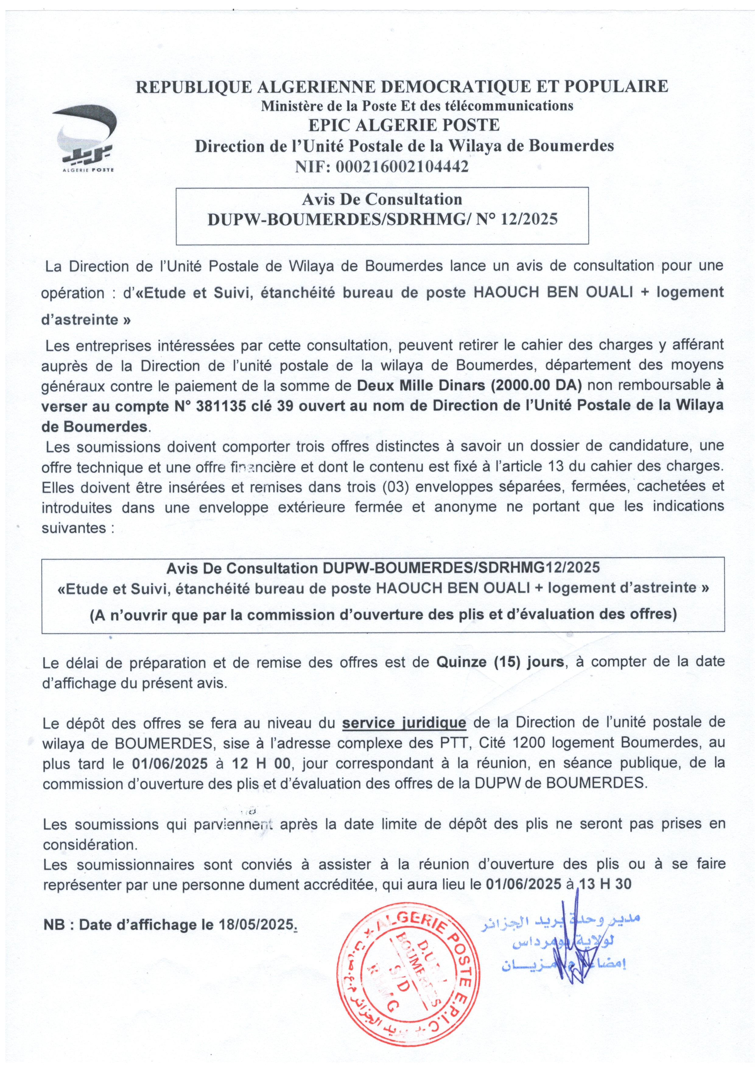 Objet : maitrise d'oeuvre des travaux de réhabilitation du bureau de poste PORT SAID DUPW ALGER CENTRE
