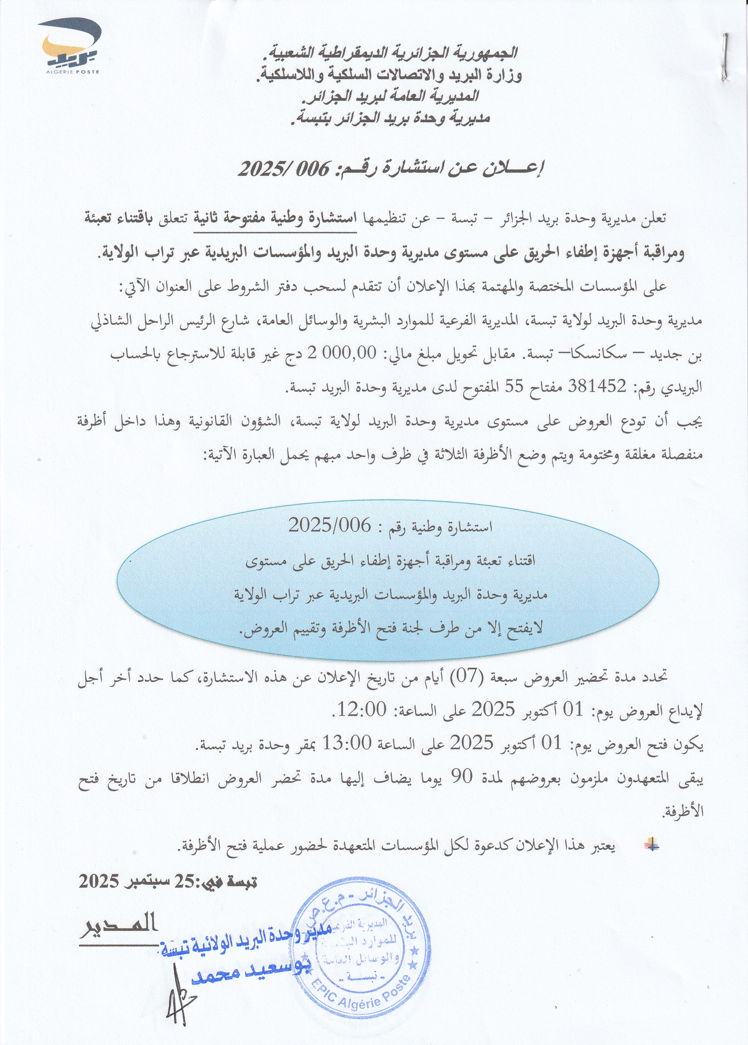 Objet : Fourniture et pose de mobilier de bureau au profit des établissements postaux (RAS EL MIAD – SIDI KHALED EST –HACI CIDA – RAS EL MIAD 1ère novembre).