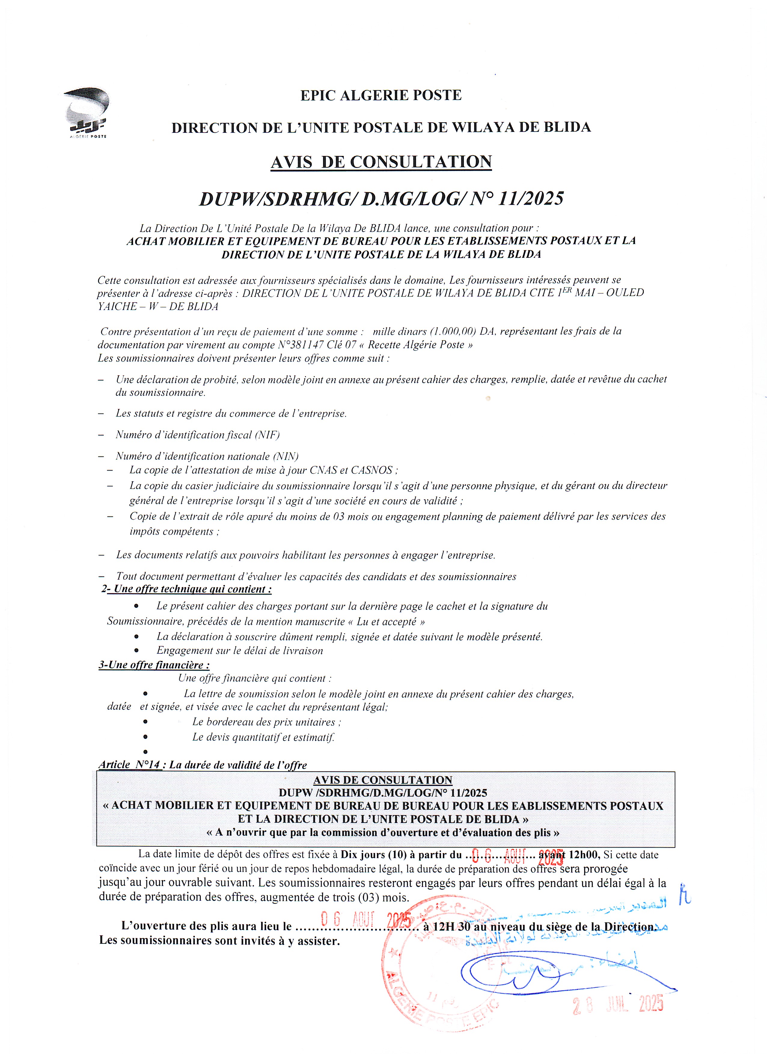 Objet : Achat mobiliers et equipements de bureaux au profit des etablissements postaux et la DUPW BLIDA